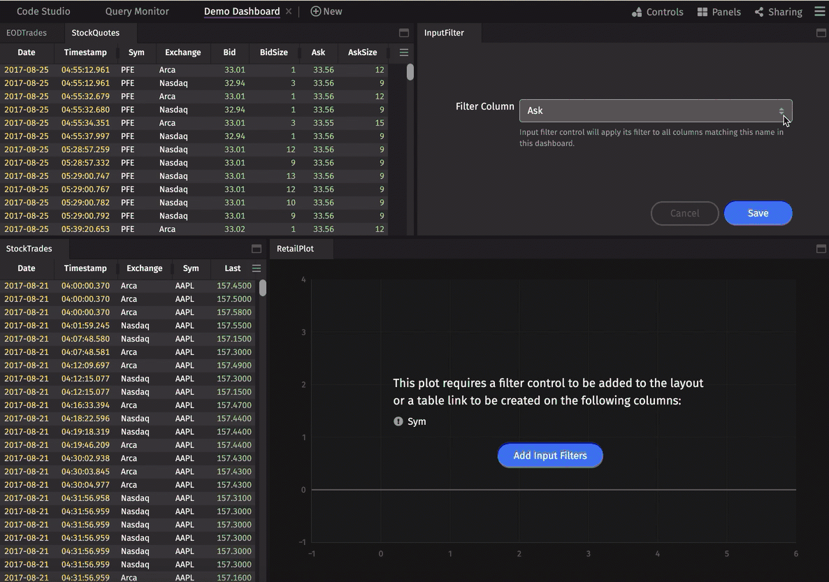 Once you choose a Filter Column from the drop-down list in the Input Filter panel, you will be prompted to enter a value. The filter statement options available in Quick Filters are based on the data types in each column being filtered. See Quick Filter Statement Options in the Appendix for a complete list. The Sym column has been chosen in the following examples. Once you enter a value, the filter will be immediately applied to your dashboard.