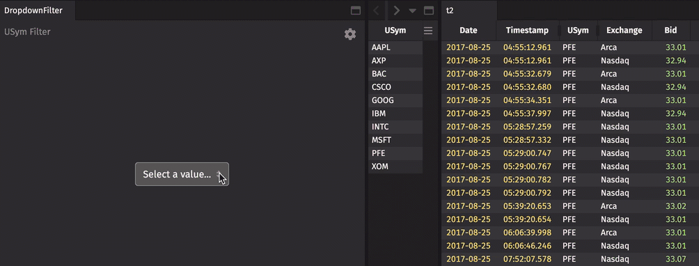 For example, the Dropdown Filter below first links to the USym column in a small table of values. The subsequent dropdown list is used to filter the USym column in the other open table to the selected value: