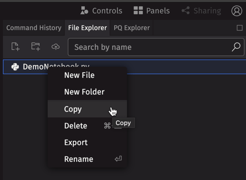 Right-click any item to open the File Explorer context menu with options to create new files or folders, delete or rename existing files, and copy the content of a notebook file: