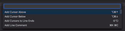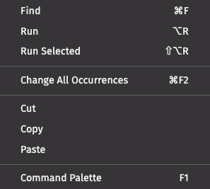 - Command Palette - Opens the Command Palette, which provides an exhaustive list of commands for editing, including keyboard shortcuts for the most common operations.