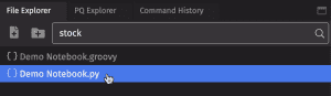 The File Explorer displays a list of saved notebooks and user folders. You can search for notebooks by content. In the example below, the File Explorer will show any notebooks that contain "stock" in the file. To open an existing notebook, highlight and double-click its name.