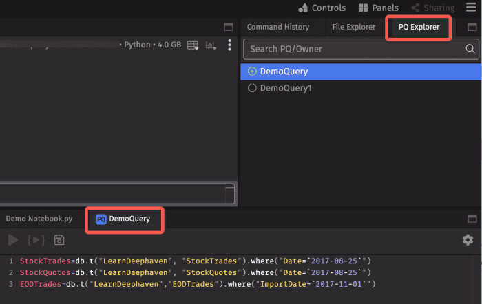 As shown above, the green circle indicates that the Persistent Query named "DemoQuery" is active, while "DemoQuery1" is not. Selecting any query automatically opens its script in a new notebook panel. When a notebook generated from the PQ Explorer is saved, any edits are automatically applied to that Persistent Query script and reflected in the Script tab of the Persistent Query Configuration Editor.