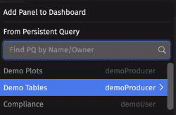 Once a PQ is selected - either by using the Search field or by manually selecting its name from the list - the tables, plots, and/or widgets created by that PQ are shown. For example, the "Demo Tables" PQ has three tables available: