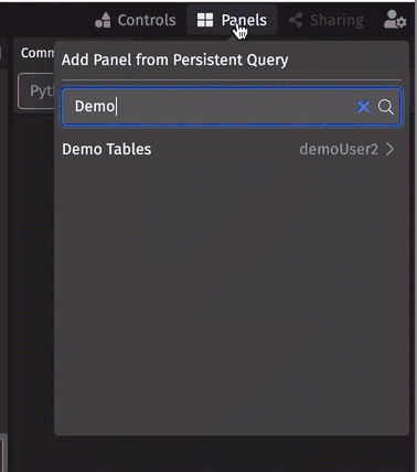 To add new tables or plots to your Code Studio or Dashboard, select the Panels button to open the Add Panel to Dashboard menu: