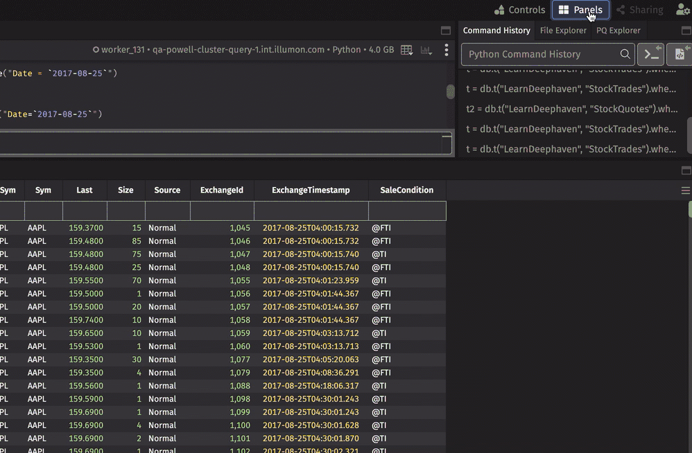 The Panels menu is located on the right side of the navigation bar at the top of the Deephaven IDE. You can add panels to Code Studios or Dashboards. Each panel contains one table or plot, though multiple panels may be nested together in one area of the layout. Panels are associated with Persistent Queries (PQs), which you can configure, edit, or restart in the Query Monitor.