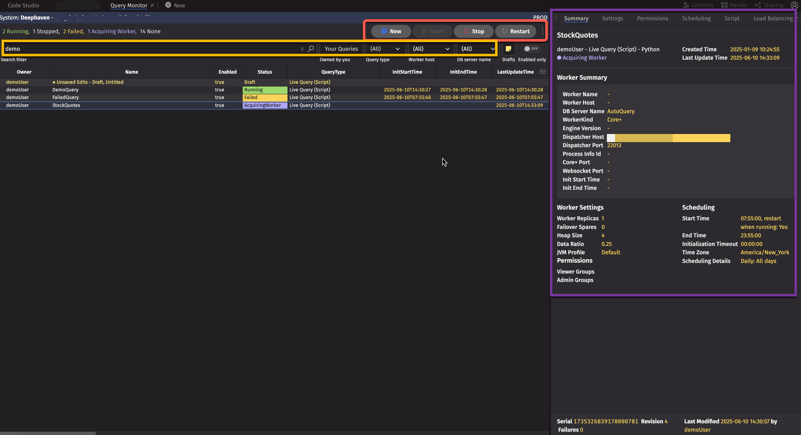 - The main feature of the Query Monitor is its central table. This table lists key details for each Persistent Query (PQ) you're authorized to view, such as its name, owner, and status.
