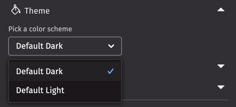 The Theme section allows you to select a color scheme for the Deephaven IDE: Default Dark or Default Light.
