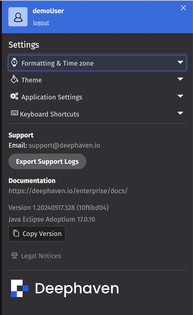 The bottom of the Settings menu contains shortcuts for contacting the Deephaven Support team via email, access to the Documentation Portal, and the version number of the Deephaven release running on the web.