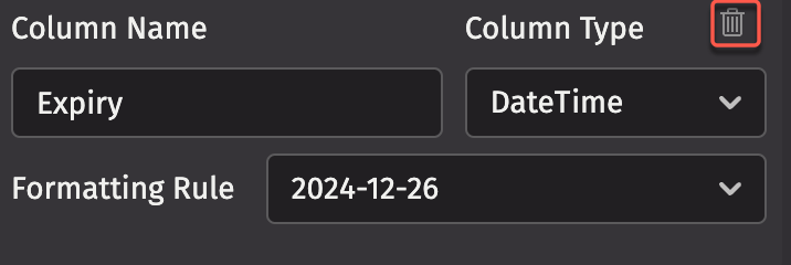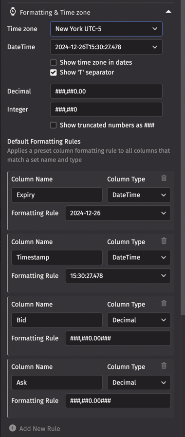 This section allows you to create specific default data formatting rules for columns that share the same name. The section opens with four default rules for columns named Expiry, Timestamp, Bid, and Ask. You can delete those rules - or other existing rules - by clicking the trash can icon to the right of the rule: