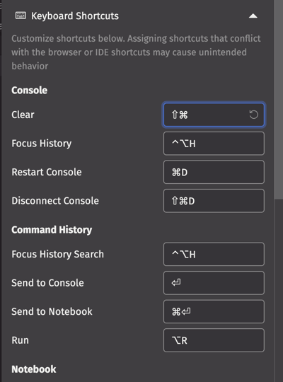 Expand the Keyboard Shortcuts option to display the current default shortcuts, and customize your preferred keyboard shortcuts for use within the Deephaven IDE. Use caution when assigning shortcuts to avoid conflicts with existing shortcuts within your operating system or browser.