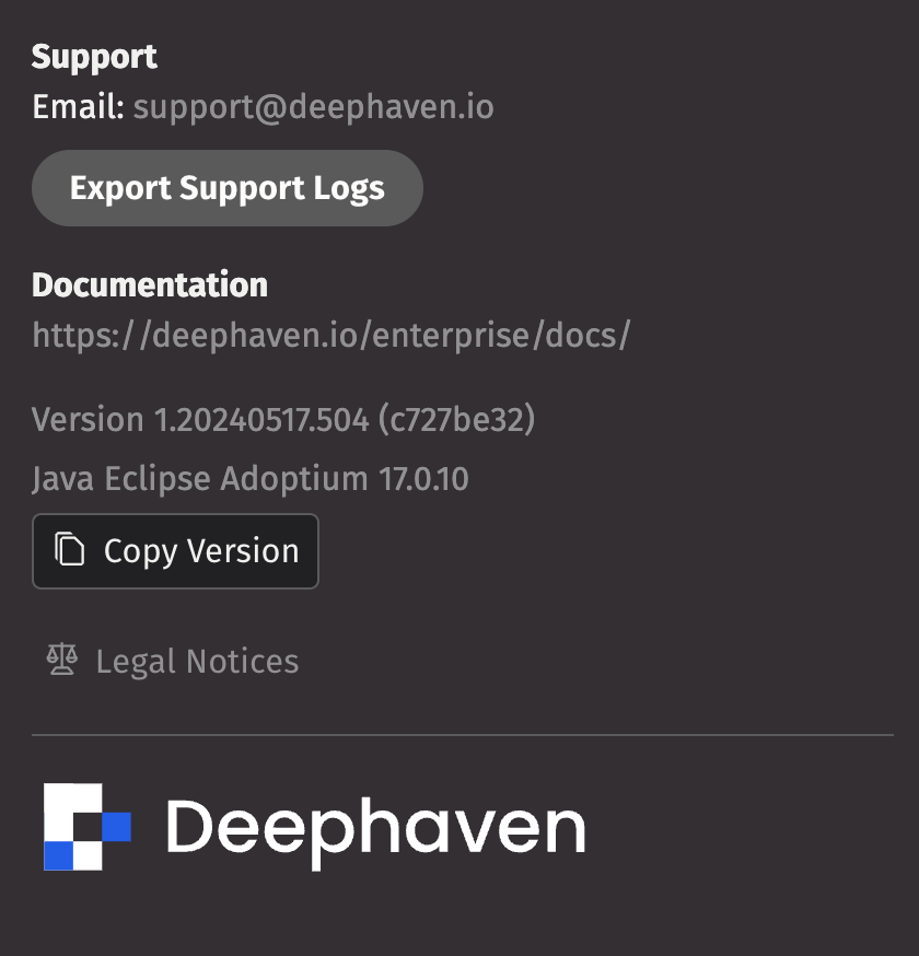 Select Export Support Logs to download and save the web client's log files to your local file system. You can then send the support logs to the Deephaven Support team to review.