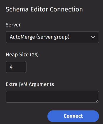 To open a new Schema Editor, navigate to the New Tab screen and select it from the Advanced menu. The Schema Editor displays a connection panel on the left side, allowing you to configure the server, heap size, and additional JVM arguments. Click Connect to start a Schema API Query that the Schema Editor uses to perform operations.
