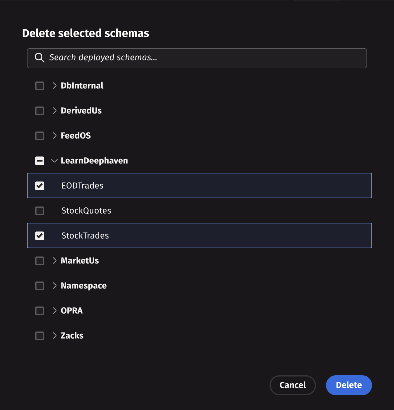 - Deployed schemas - A tree view of schema namespaces that expand to show table names of deployed schemas; select a schema to edit.