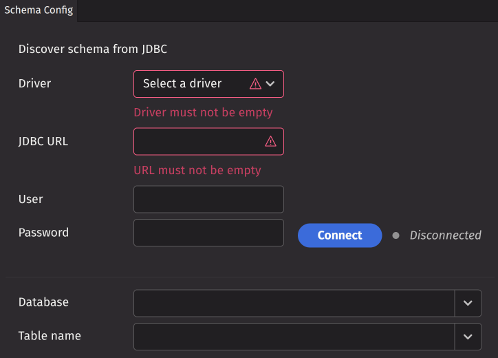 This option allows you to generate a schema from a JDBC connection. To establish the connection, complete the following fields: