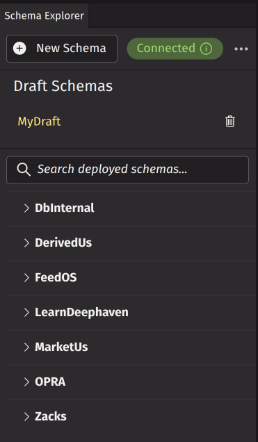 - Draft schemas - Displays draft schemas that have not been deployed (this section is omitted if there are no drafts).