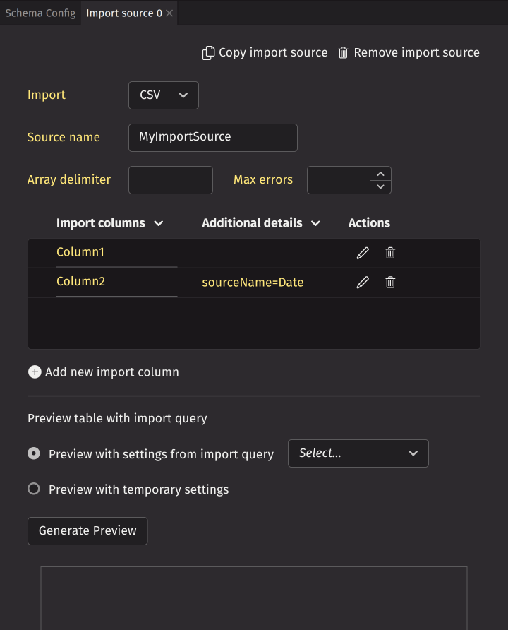 At the top, you can copy or remove the import source. You can specify the import source name, array delimiter, max errors, and add import source columns. Below, you can generate a preview of the import source using settings from a query or with custom temporary settings.