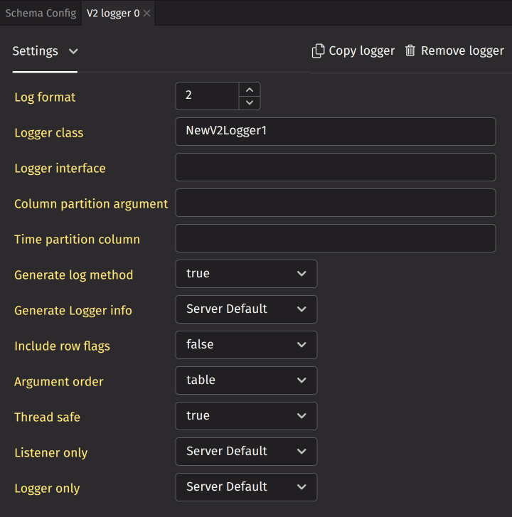 At the top, you can copy or remove the V2 logger. You can specify the logger class, logger interface, column partition argument, and time partition column. Additionally, you can set various flags. These default to "Server Default", which means the logger will use the default value on the server if the value is not explicitly set in the V2 logger.