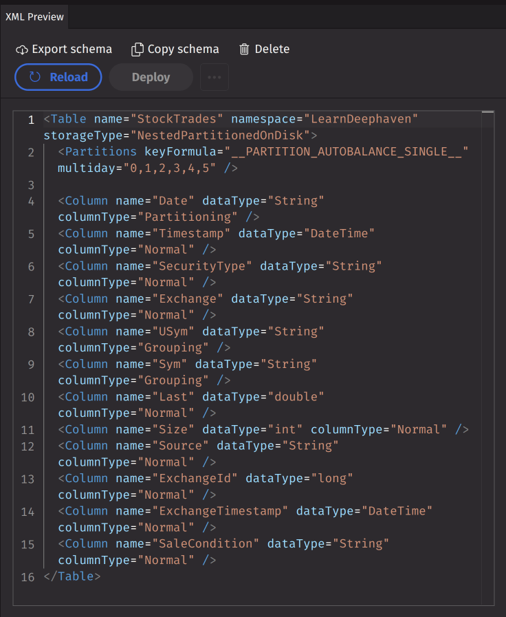 When the preview appears correct, specify the namespace, table name, and partition column. Click Generate schema to create schema XML that can be edited and deployed.