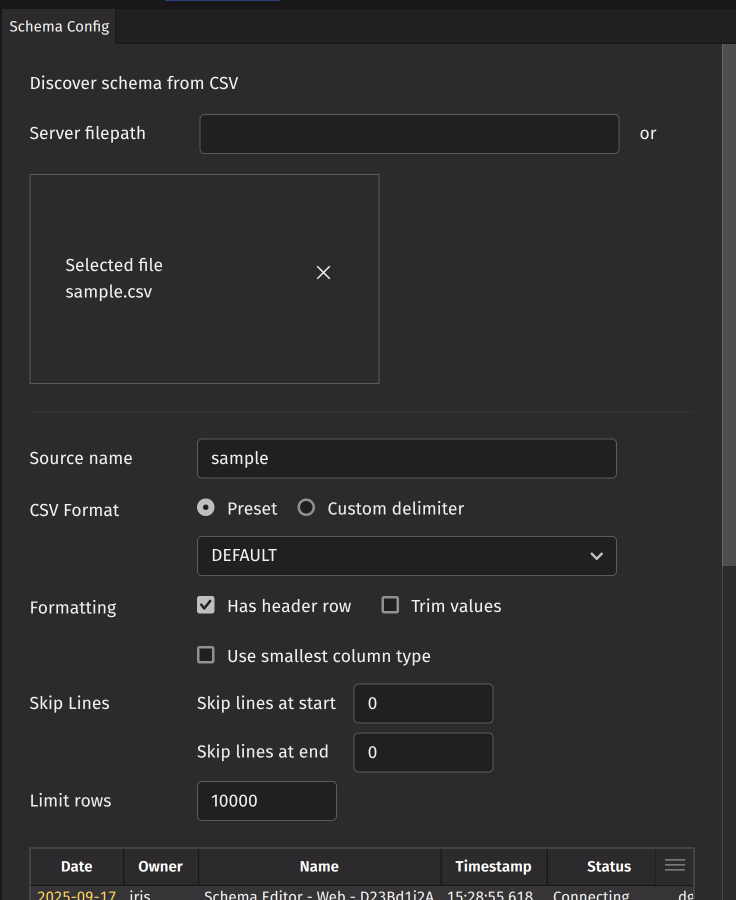 This option allows you to generate a schema from a CSV file. Select a file on the server by entering the full file path in the Server filepath text box, or choose a local file by clicking Select files... or using drag and drop.