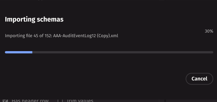 Bulk import allows you to upload multiple local schema XML files to the server. Click Bulk import to open a file selection dialog where you can select multiple files. A progress dialog will display the import status for each file.