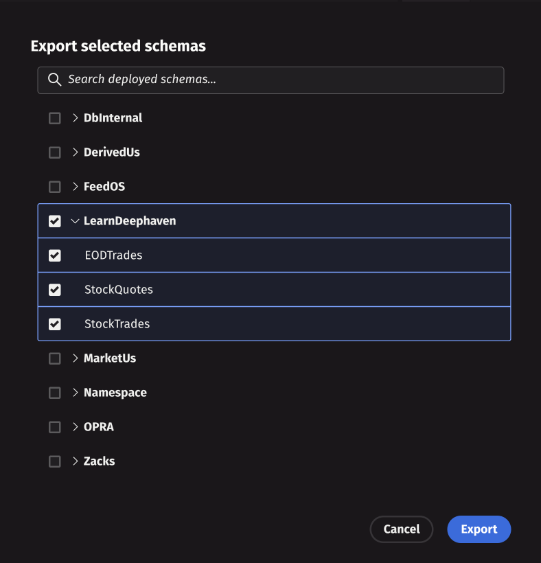 Bulk export allows you to download multiple schemas from the server. Click Bulk export to open a dialog where you can select multiple schemas. After making your selections, click Export to begin the download process. A progress bar will display the download status, and the schemas will be saved as a zip file archive to your local machine.