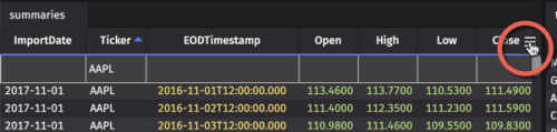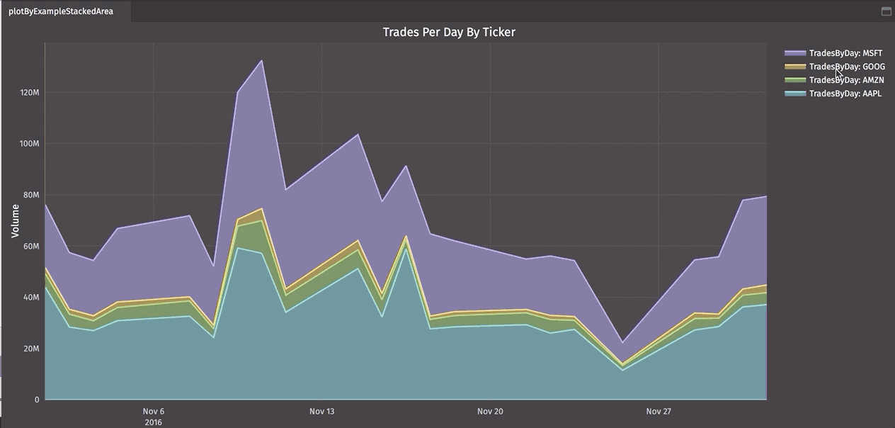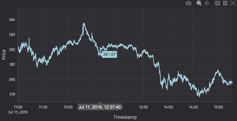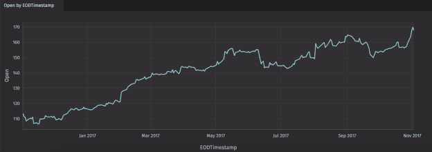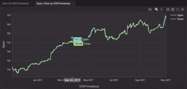The plot will open as a new panel in your workspace. The chart title is generated automatically based on your selections. In the example below, the chart is titled "Open by EODTimestamp", which are the names used for the Series and X-Axis columns, respectively.