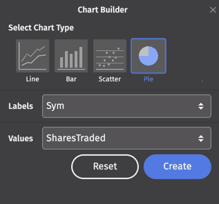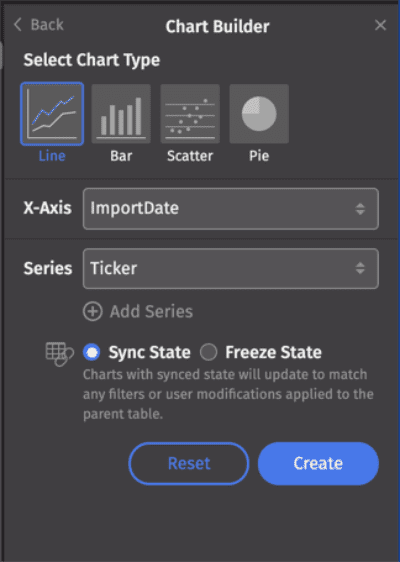 The Chart Builder allows you to create applicable charts from the table data. The configuration options will change to reflect the available chart types, and each field is automatically populated with the column values in the table from which you opened the menu. You can choose from four different chart types: