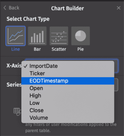 For Line, Bar, and Scatter plots, you will be prompted to select an X-Axis value and a Series value. Clicking in each field reveals the available column values in that table: