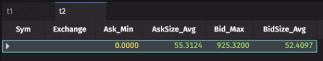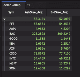 rollupmethod. It then chains a series of aggregations using theAggCombomethod. - Be sure to give the new columns in your table unique names; i.e., this query calculates two averages, however, the column names are distinguished as "AskSize_Avg" and "BidSize_Avg". (Using two columns named Avg would cause the query to fail.)