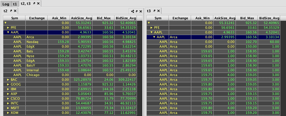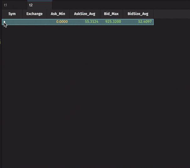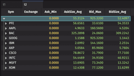 Below, you can see the Roll-up Table opened to the first level of distinct Sym values. The other four columns in the table (Ask_Min, AskSize_Avg, Bid_Max, and BidSize_Avg) show the selected aggregations for each of the ten distinct Symbols.