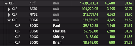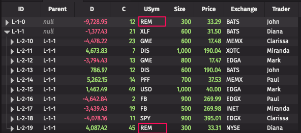 If we apply a filter Trader in `Clarissa`, we end up with the following result. Note that the deepest level is filtered to only contain Clarissa, but the values of the roll-up aggregation at the parent node have not changed. This filtering is much more efficient since the engine is not required to recompute the entire Roll-up.