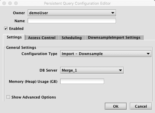 Options available in the Show Advanced Options section of the panel are typically not used when importing or merging data. To learn more about this section, please refer to the Persistent Query Configuration Viewer/Editor.