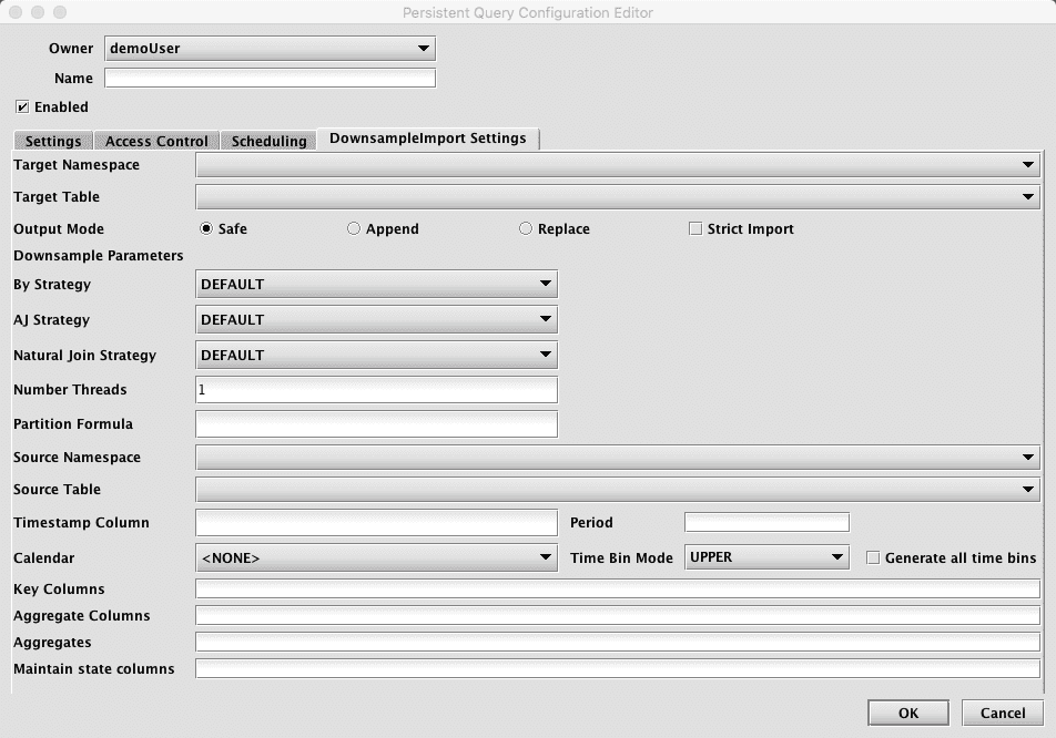 When Import - Downsample is selected, the Persistent Query Configuration Editor window shows the following options: