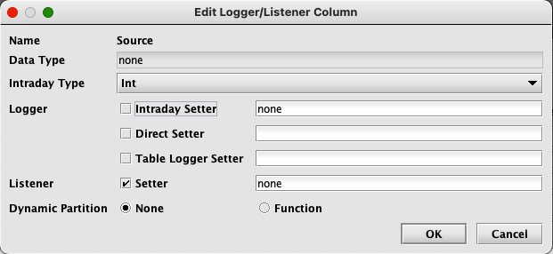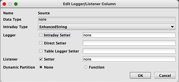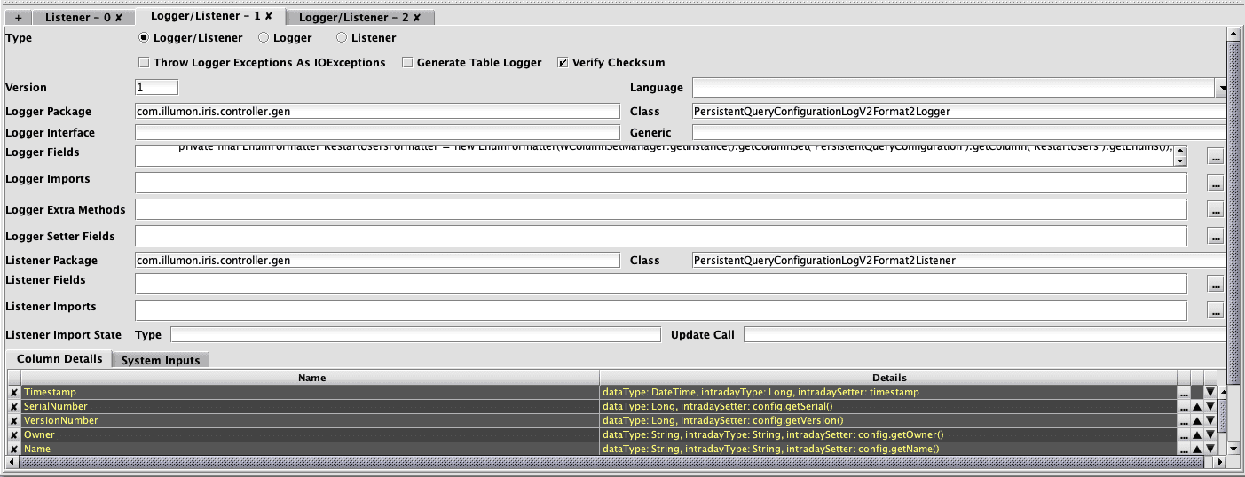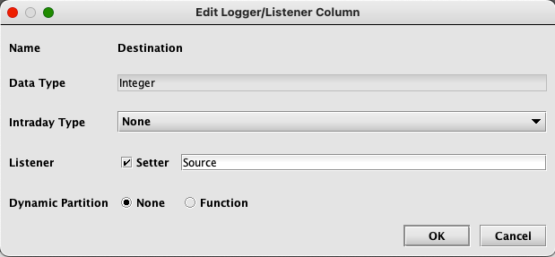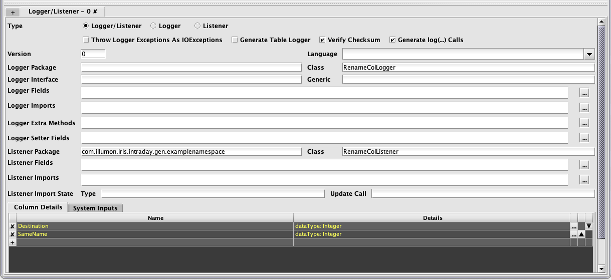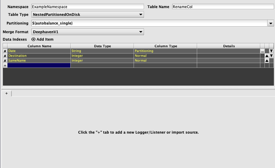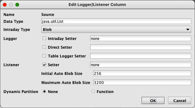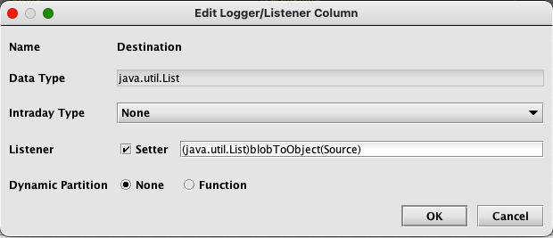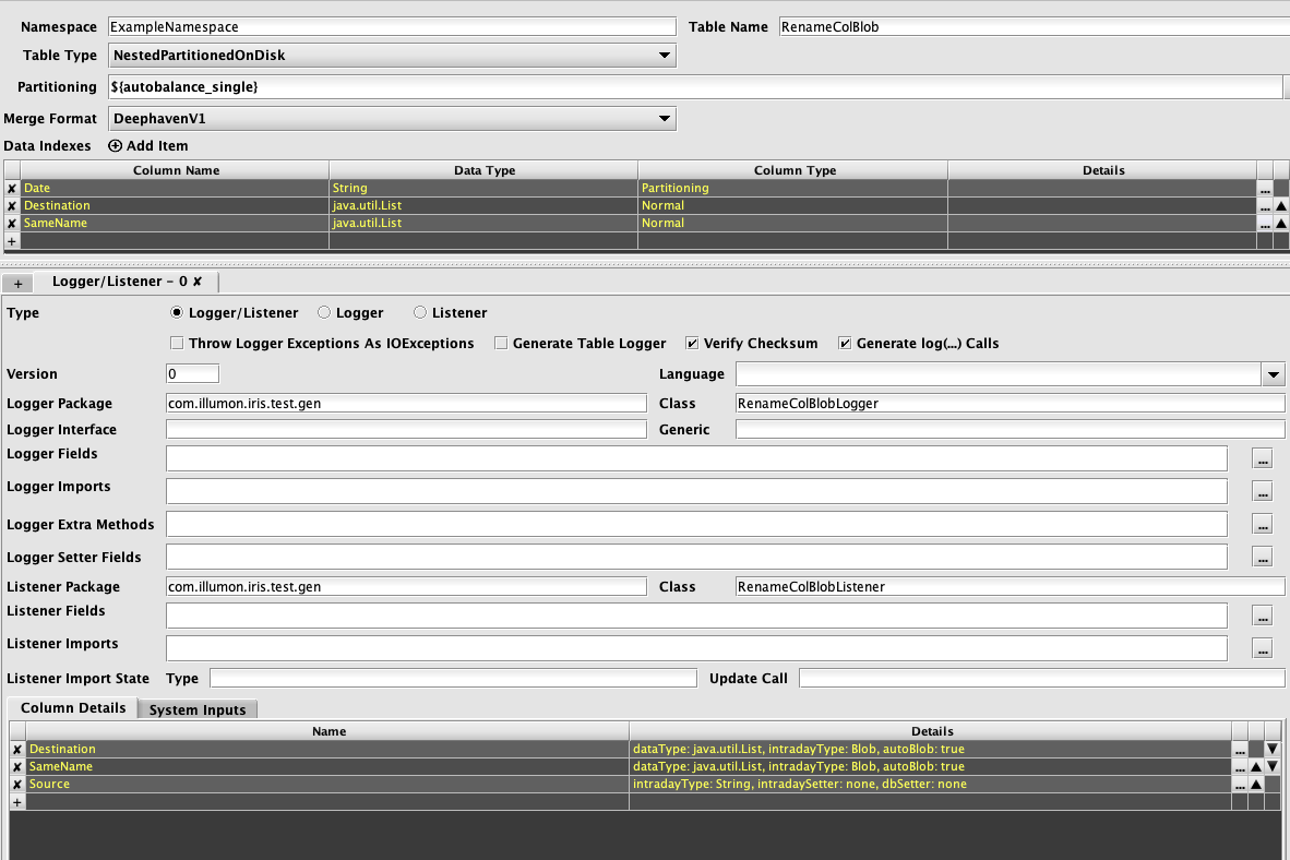 Let's pick up our above example afer we've created the the table columns Destination, SameName and log file column Source - all of type java.util.List, which is stored as a Blob. Before editing the Source column in the Logger/Listener section, the UI should look as below: