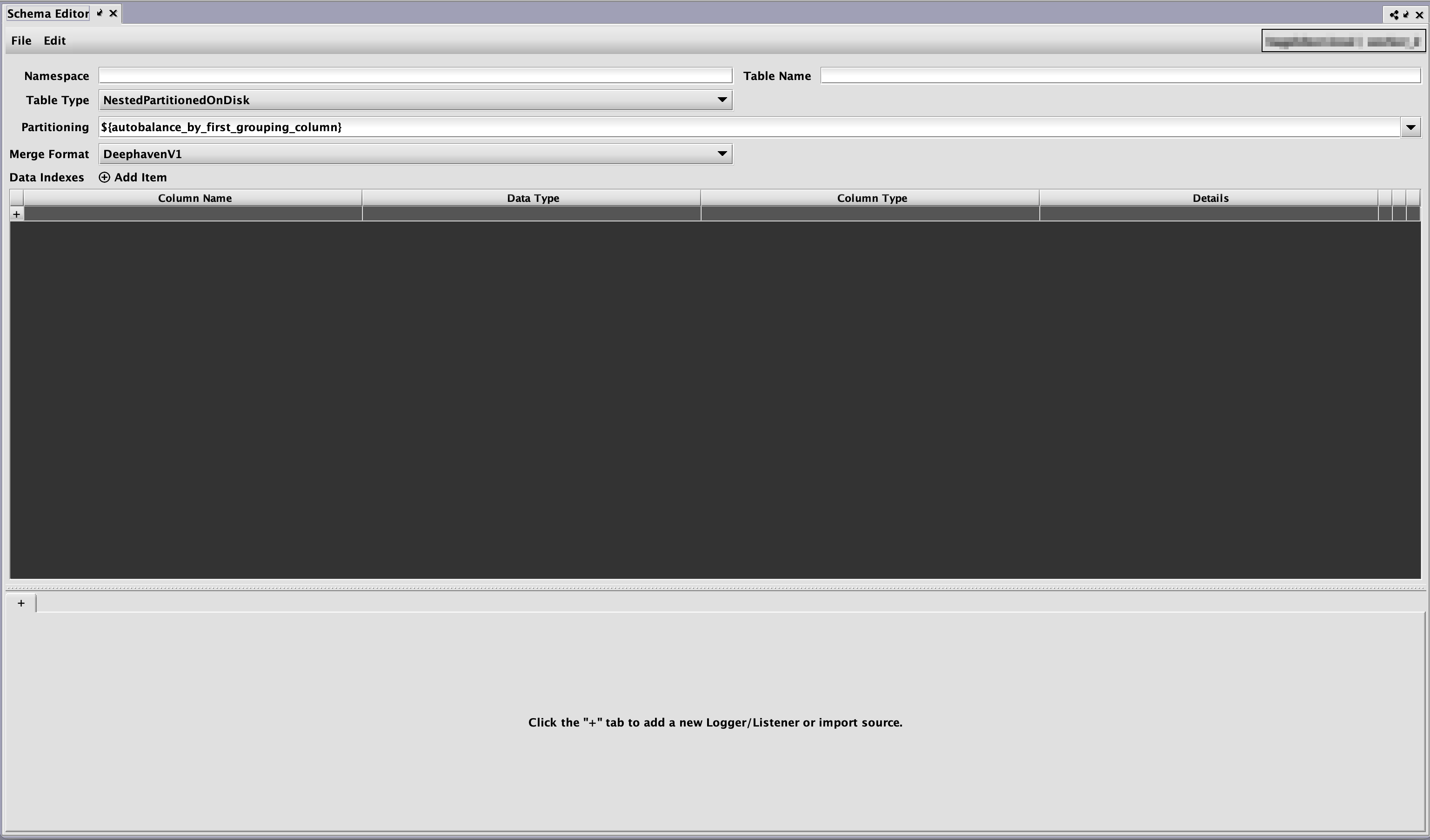 In the Schema Editor, select File -> New Schema File to open a blank Schema Editor screen. Enter the Namespace, Table Name, Table Type, Partitioning, and Merge Format details.