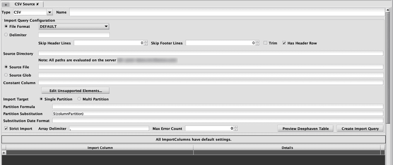 - The Preview Deephaven Table button will create an in-memory table in Deephaven and import the data from the selected source using the current schema. This allows validation of the schema and import settings without having to deploy the schema and without having to create table data files on the server. The import preview is generated on the Deephaven server, so any files, classes, or database connectivity required for the import must be available from your Worker. This is because imports run on the server, and this makes the preview more consistent with the eventual import job.