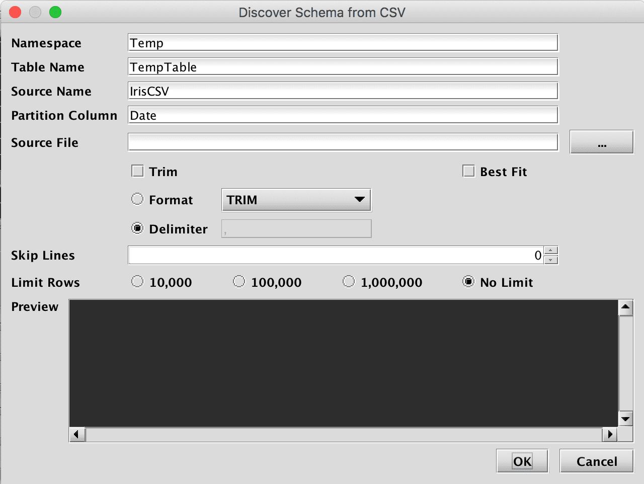 - The Preview panel allows the user to quickly see whether properties such as the file format, delimiter, and number of lines to skip, are correct for this file. The Preview panel initially reads a few rows from the file, and will load more rows as the user scrolls to the bottom of the grid.