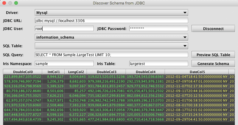 - Discover JDBC Schema… enables users to review the schema layout information from a sample data set from a JDBC-based source.