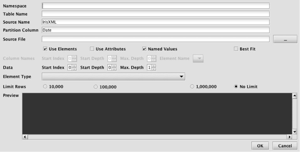 The Limit Rows setting can be used to speed analysis of XML data when the sample file is large. However, this requires that the values found in the first rows of the table are sufficiently representative of those found later in the data set.