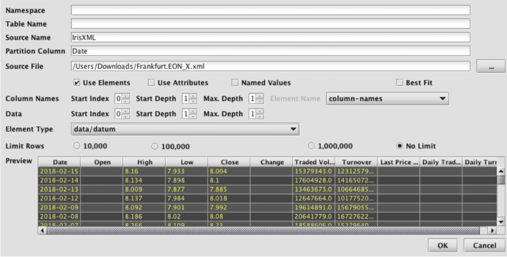 XML itself is simply a container format that provides various ways to store data. As such, only certain uses of XML lend themselves to generic import by the Deephaven XML importer. The XML parsing settings of this dialog allow tuning of the XML importer to handle a variety of common XML data organization formats. In order to be importable by this tool, an XML file must have data that can be loaded into a single table, and that has unique field names per record. A data file can have field names included with the data (named elements or named attributes), or can use positional fields, with a separate section of the document providing the field names.