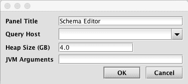 After selecting Schema Editor in the drop-down menu, a dialog window will provide options for renaming the Panel Title, selecting a Query Host (required), adjusting the Heap Size, or providing additional JVM Arguments: