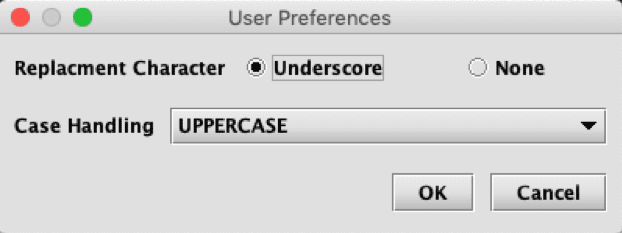 - Once your selections are made, click OK and the current workspace will be saved. The replacement and casing preferences are then available from the workspace to be fed to the schema creator classes.