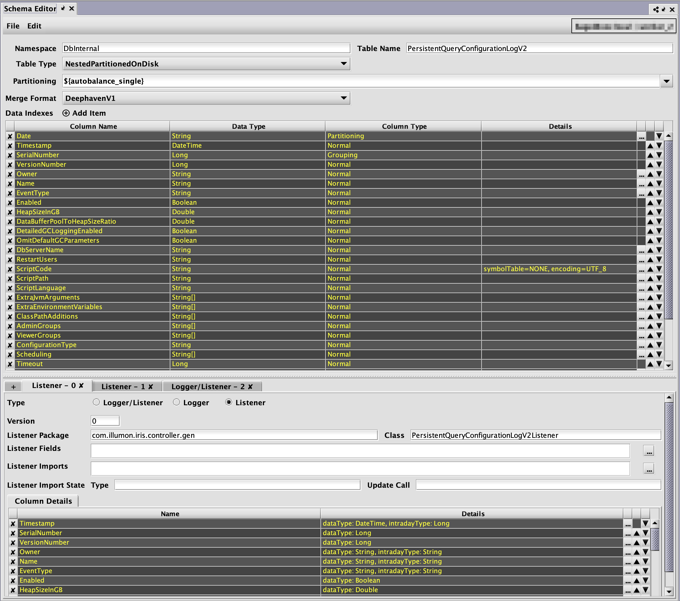 For example, the following image shows a fairly complex schema in the Schema Editor after opening the PersistentQueryConfigurationLogV2 table from the DbInternal namespace: