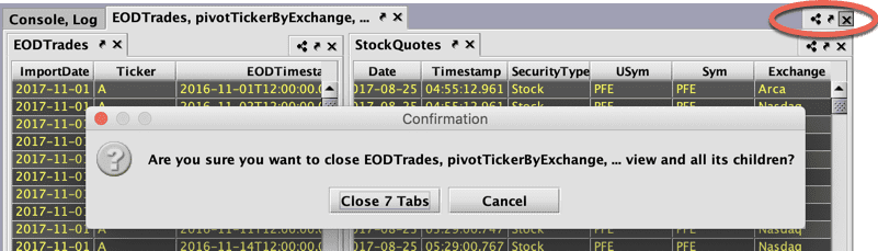 All tabs feature a close button. You can close individual tables in your workspace, or entire panel groups. For example, the multi-close button at the right of the workspace below will close all seven tabs in that group: