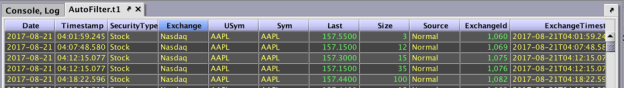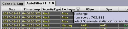 This query generates the t1 table using data from the StockTrades table in the LearnDeephaven namespace, filters the data to show only data from August 21, 2017, applies the layoutHints method, and then creates an AutoFilter for the USym, Exchange, and Size columns.