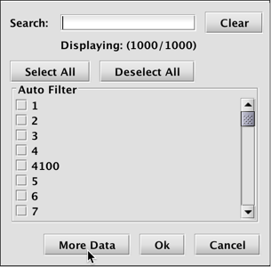 If the column contained more than 1,000 unique values (such as Size), a More Data button would appear. When selected, the menu could then return up to 1 million unique items.