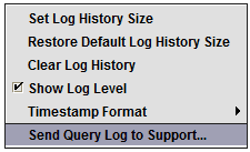 To attach this log (the Query Log), right click anywhere in the Log window and select Send Query Log to Support.