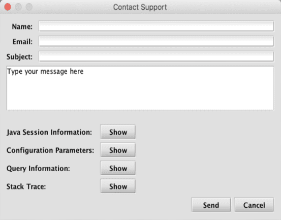 When Contact Support is chosen, a dialog window similar to the following will open: