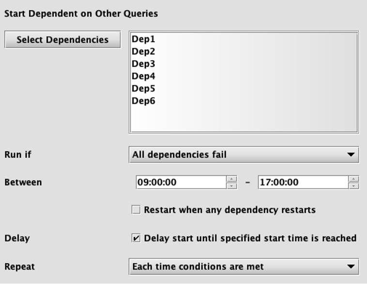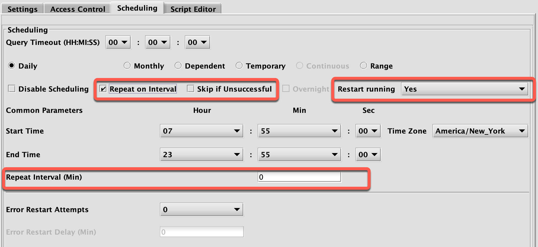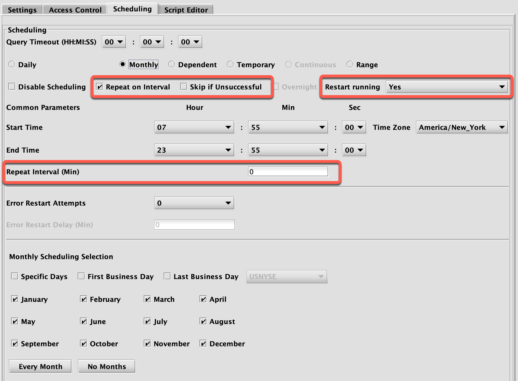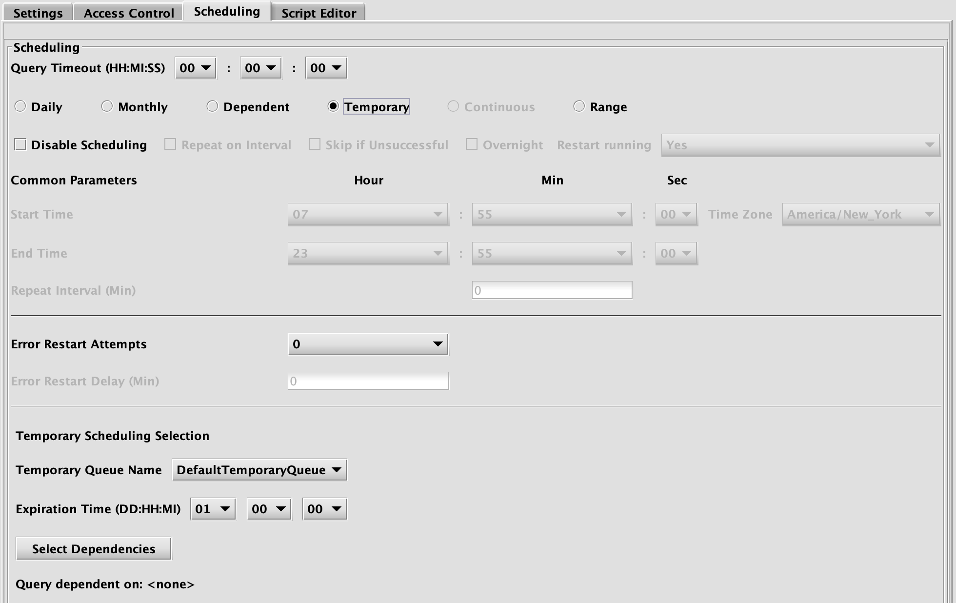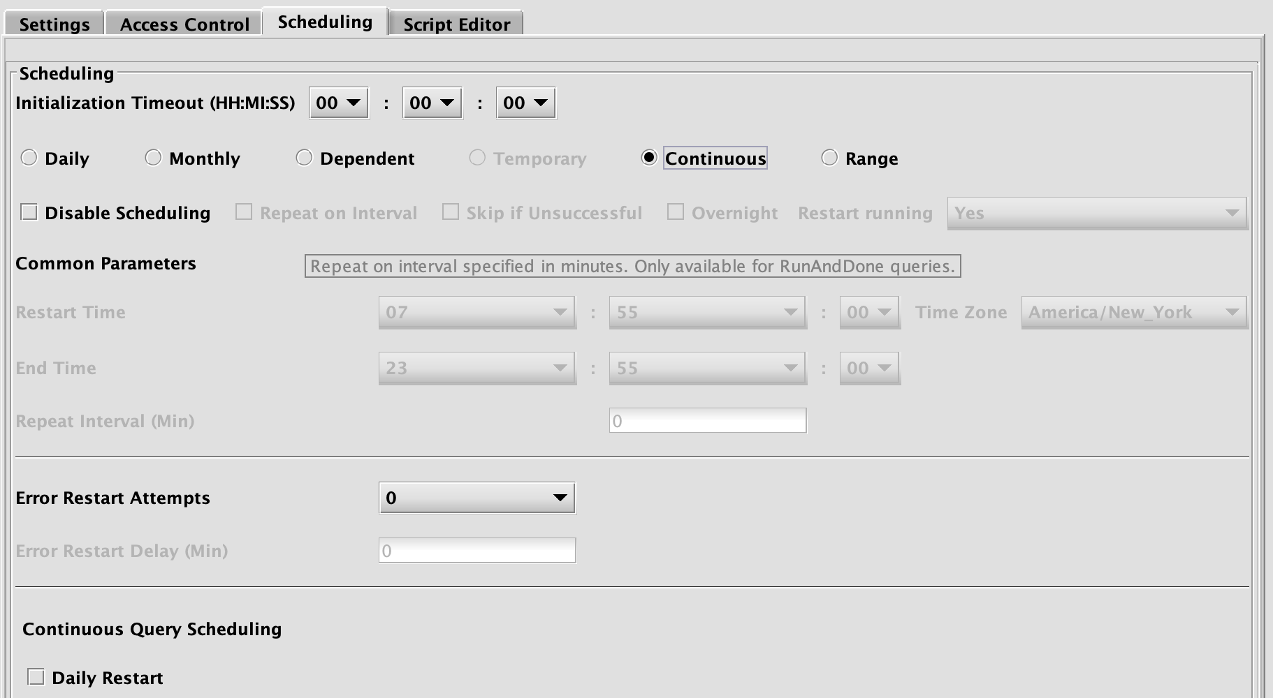 These queries can be scheduled for certain times and/or dates by using the settings in the Scheduling tab in the Persistent Query Configuration Editor. All scheduling parameters are available except for the following: