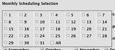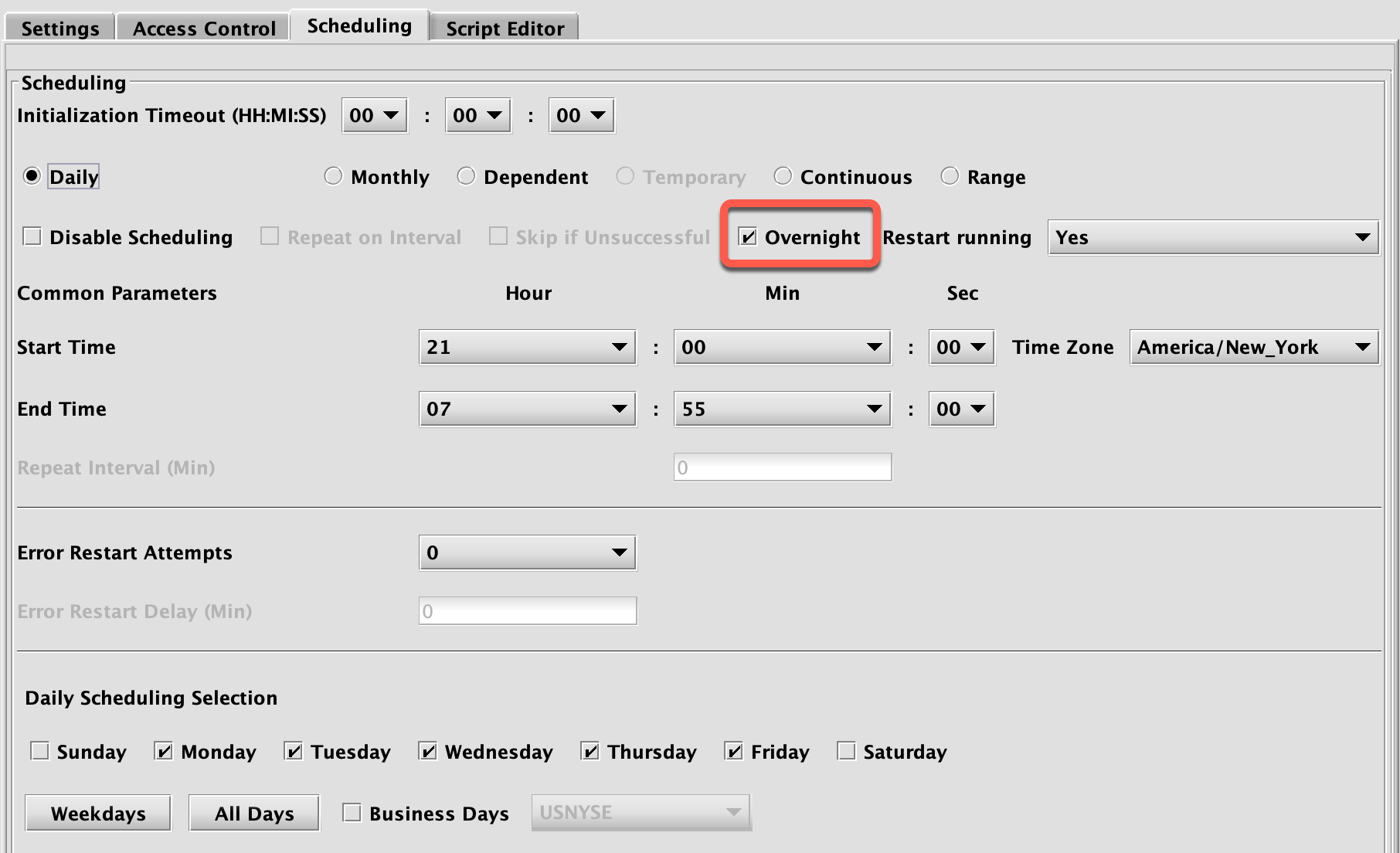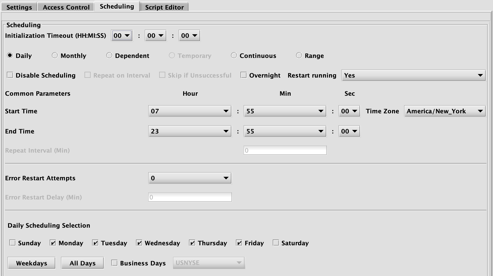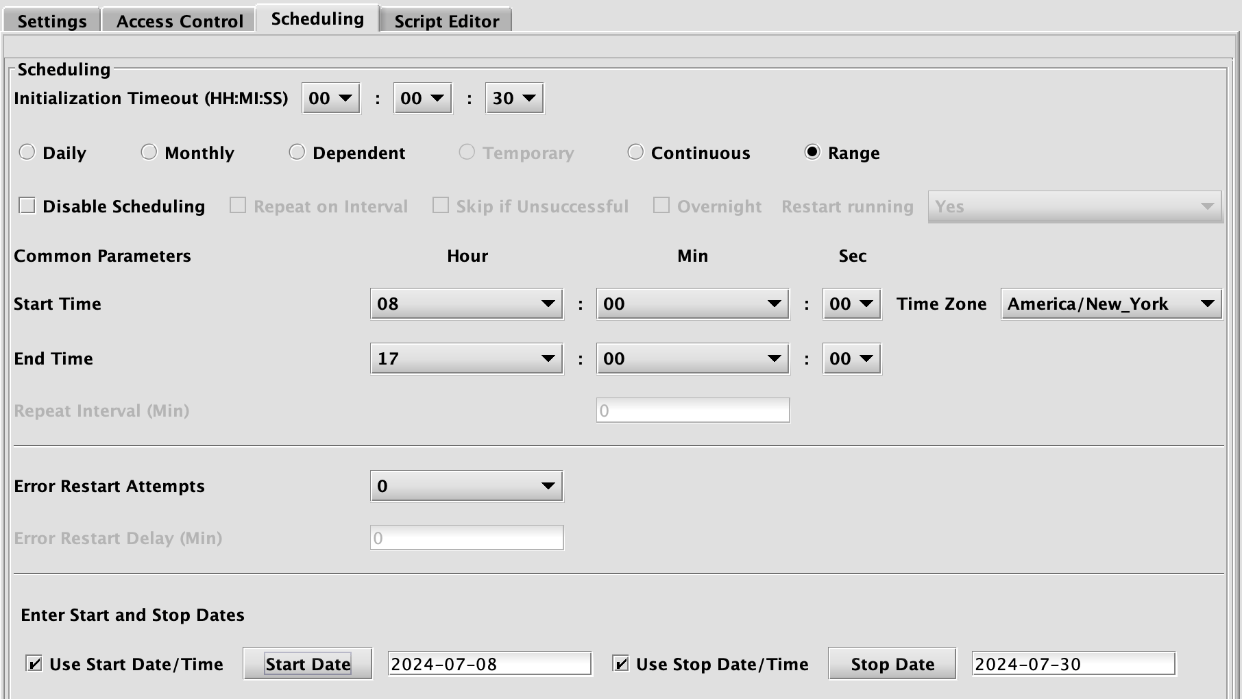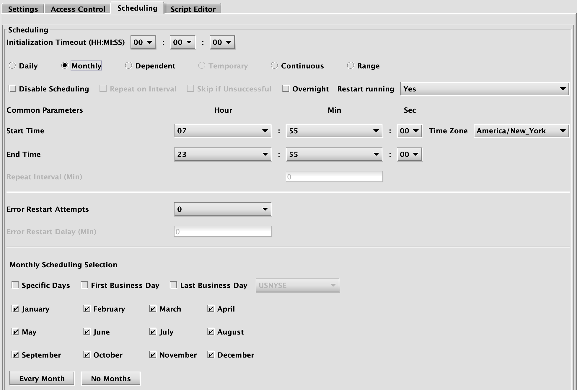 These queries can be scheduled for certain times and/or dates by using the settings in the Scheduling tab in the Persistent Query Configuration Editor. All scheduling parameters are available except for the following: